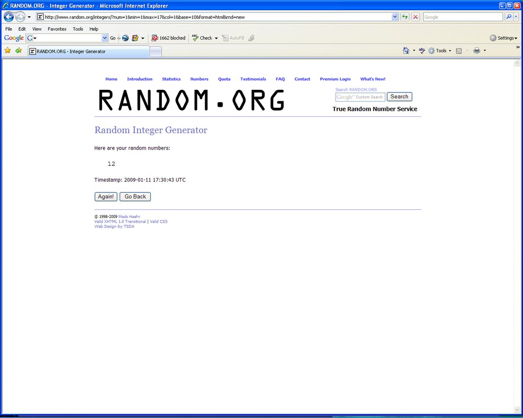 Spudman then used a well-known random number generator at Random.org to randomly select an integer between 1 and 17. The result was 12, as shown in this screenshot (click on the image to see a larger version). And #12 was Mr. Renman!