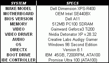 The main testing was done on my Dell Dimension XPS-R, configured as shown at right.