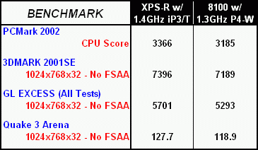 In all cases, the 1.4GHz iP3/T edges out the P4. I found this very surprising, frankly. Extrapolating from the 1.3GHz Willamette numbers, I calculate that it would have taken a P4-W of about 1.4 - 1.5GHz to match the iP3/T's performance. So, in other words, the performance of the Tualatin Celeron-iP3/T and Willamette P4 is ESSENTIALLY IDENTICAL in these benchmarks on a clockspeed-equivalent basis, despite the "superior" CPU, chipset and memory used by the 8100. Not a bad showing for a system built upon technology that's TWO AND A HALF YEARS OLDER! Looks like that old XPS-R may have a couple of years of useful life left in it yet!