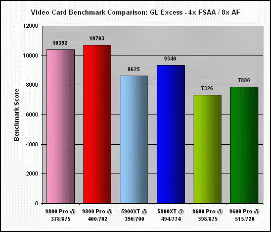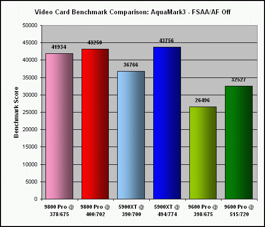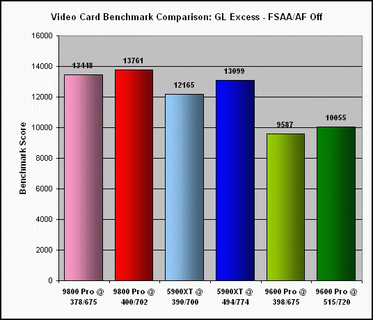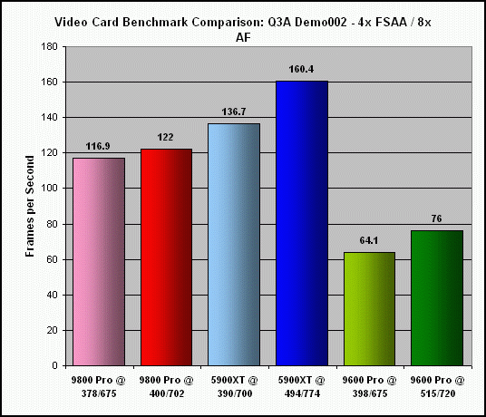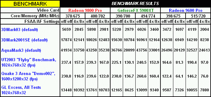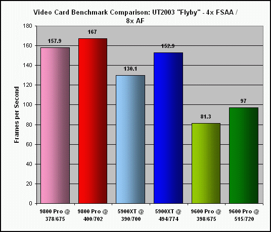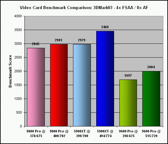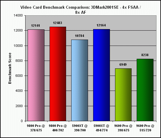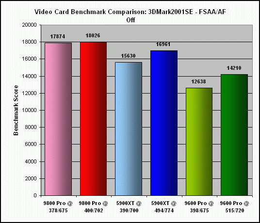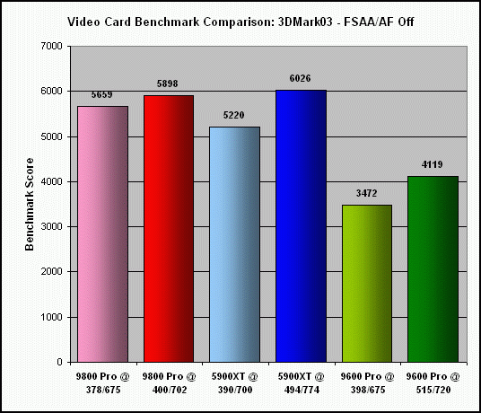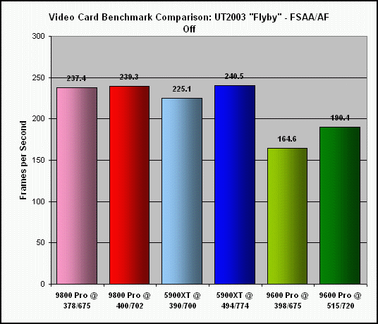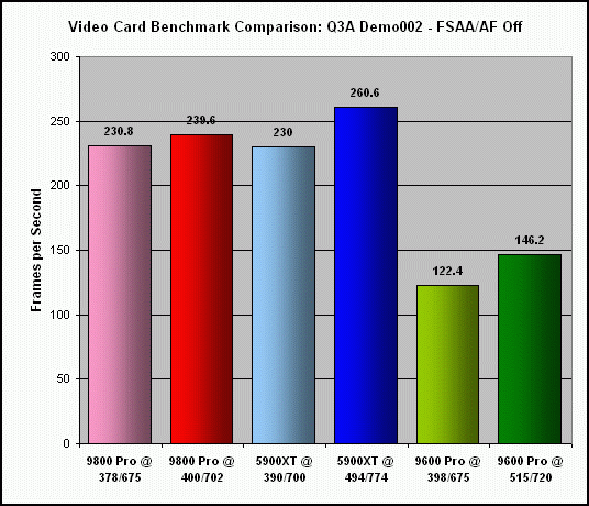 As previously indicated, the extent to which my Sapphire Radeon 9800 Pro (actually a non-Pro card, flashed with the Pro BIOS) could be overclocked was significantly less, at 6% for the core and 4% for the memory. Not surprising, since the BIOS flash was basically an overclock of the non-Pro card to begin with. Consequently, this really isn't a fair comparison to the other two cards.