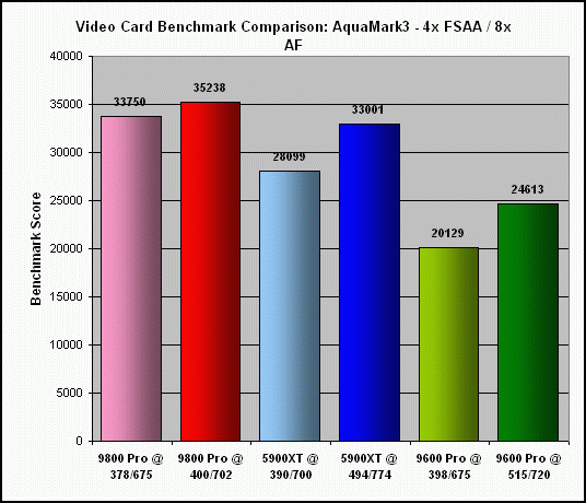 Anti-aliasing/Anisotropic Filtering Performance Penalty - It's well known that turning up these two visual quality enhancement parameters--particularly the anti-aliasing--imposes a frame rate penalty in games and benchmarks. For the earliest video cards that offered this feature, it was virtually unusable, because it tended to turn games into "slide shows", even at low resolutions. Happily, things have changed quite a bit, and the performance penalty with these newer cards is much less. Once again, the 9800 Pro and 5900XT were virtually identical in this regard, with both showing a 34% average performance penalty for 4x AA / 8x AF settings. The 9600 Pro was not far behind at 40%. The good result for the 5900XT shows some significant improvement for Nvidia in this area. The last Nvidia card I tested, the 5600 Ultra, showed an alarmingly high 49% performance hit at the same settings.