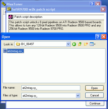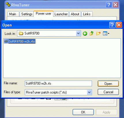After installing Riva Tuner, I fired it up to run the patch. This process is a little convoluted, so I'd follow the directions posted in the SoftR9700 FAQ on the Guru3D Riva Tuner forum, to insure that you do it correctly. Basically, you need to fire up Riva Tuner, click on the Script icon on the Power Users tab, and then navigate to the subfolder where the SoftR9700 script resides and run it. Once you start the script, you'll be prompted to navigate to the folder where your drivers reside. Do NOT attempt to patch the installed version of the subject file, "ati2mtag.sys", within your Windows directory. This is a recipe for trouble, particularly with XP's file protection feature, which will repeatedly replace the patched file with the unpatched original, undoing all your hard work! Instead, browse to the location where the ATI driver files were extracted when you initially installed them (by default, C:\ati\support\) until you find the target file to be patched ("ati2mtag.sy_", the original, compressed version of the driver file). If the patch runs successfully, you'll get a screen message to that effect. If you look in the subfolder, you should now see a file named "ati2mtag.sys" and another named "ati2mtag.old". The former is the patched version and the latter is a backup of the original, in uncompressed form.