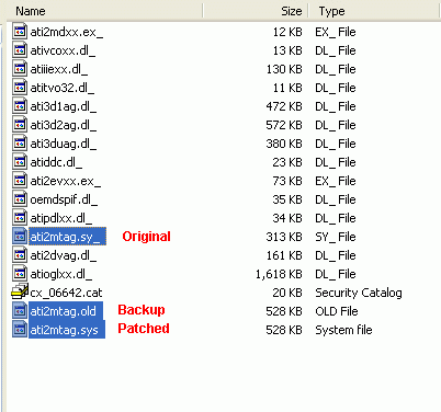 - Copy the hacked driver file, "ati2mtag.sys", to the above subfolder.