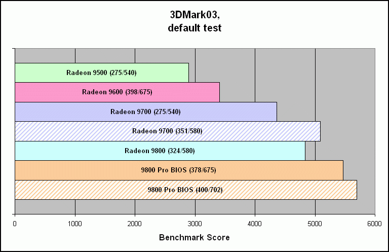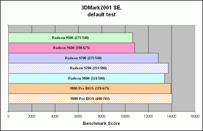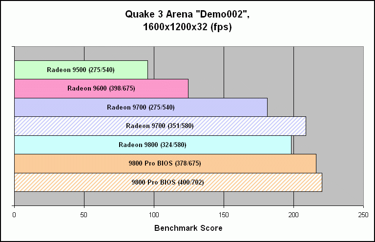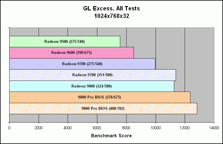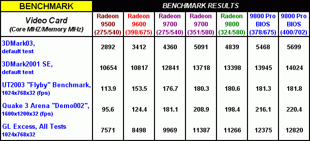 The results obtained from the completed testing is summarized in the following data table and charts. All testing was run with antialiasing turned off and with filtering set to bilinear. Memory clockspeeds are shown doubled to reflect the effective speed, since all cards use DDR RAM. Also included for comparison is data I recently generated under the same exact testing conditions on a Sapphire Radeon 9500NP, a Powercolor Radeon 9600 Pro "Bravo", and the 9500NP soft-modified to run as a 9700. The latter card was tested both at default 9700 clockspeeds and overclocked to approximate 9700 Pro performance. Here's the data: