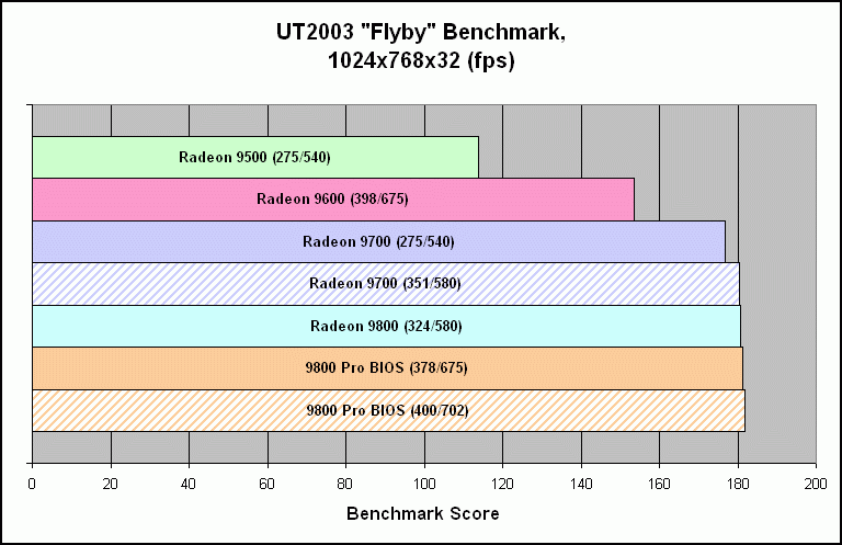 One thing that is readily apparent from perusing the data table and charts is that, when testing video cards in this high performance class, I'm going to have to increase the testing resolution for 3DMark2001 SE and the UT2003 "Flyby"! At the 1024x768 resolution setting used, these two benchmarks basically become CPU tests on my Dimension 8100 with these high-end vid cards. 3Dmark2001 SE at 1024x768 appears to become CPU-limited on my test rig at a score of just over 14,000 Marks, and the UT2003 Flyby tops out at about 182 fps. Though this resolution is still useful for mid-range video cards like the Radeon 9600 Pro or GeforceFX 5600 Ultra, it just doesn't "push" a 9700 or 9800 series card hard enough. Live and learn....