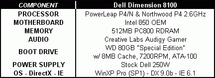 The benchmarking was done on my trusty Dell Dimension 8100, upgraded to a 2.6GHz Northwood P4 using the PowerLeap P4/N adapter technology (details available HERE). System specs are shown in the table at right.