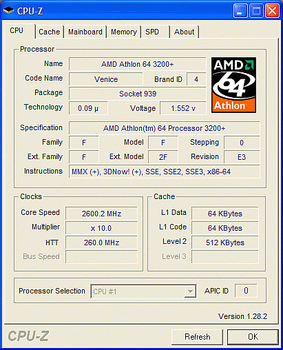 So a shiny new 3200+ Venice chip was ordered from ZipZoomFly.com ($198 including shipping), delivered by FedEx, and a new round of overclocking began. This time, the results were much more encouraging. While the stratospheric clockspeeds reported by several websites were once again out of reach (see rant above!), the new Venice processor was able to reach 2.60GHz with good Prime95 stability, a very respectable 30% overclock and a full 250MHz higher than the Winchester chip would go. That would correspond to a value of about 4100+ on the Athlon 64 rating scale--not too shabby for a processor selling for under $200! This result was obtained at 10% over-voltage on the core (about 1.54V) with air cooling via the aforementioned Thermaltake XP-90 cooler. Core temperatures under full processor load don't exceed the low 50's C, which seems quite acceptable to me. Here are some CPU-Z screenshots of the two Athlon 64 processors running at default speeds and at maximum stable overclock: