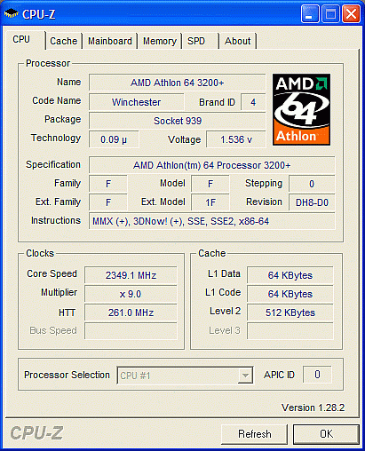 - Rumor has it the early '05 Winnies just weren't as good - As I've poked around on the web, this point comes up again and again. It's anecdotal information that I've never seen backed up with any statistically significant data, but it appears to be widely accepted as true. The claim is that the Winchester 3200+ chips that first appeared back in the fall of 2004 tended to have considerably more overclocking "headroom" than the ones produced just after the turn of the year. It's not clear if this is just result of natural variation in chip fab production yields or perhaps reflects the practice of "binning", i.e. testing and segregating production, with the processors capable of higher clockspeeds being sold as the higher priced 3500+ version. In any case, I encountered numerous references to this phenomenon, and my particular chip was manufactured during the 3rd week of January.