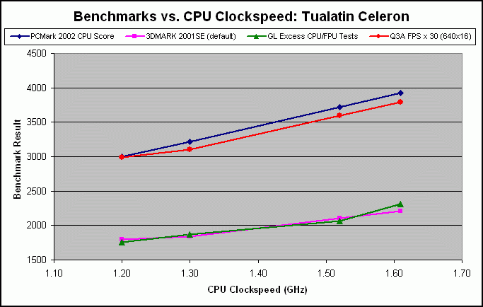 The chart plots the results of four selected benchmarks vs. the CPU clockspeed. Here, I intentionally selected four test results that were heavily CPU-dependent, to give a clearer indication of the potential impact of the processor clockspeed on system performance. When interpreting this chart, one has to keep in mind that the actual performance increase seen from overclocking a Tualatin Celeron will almost certainly be less than this chart shows, because it is rare that a given "real world" performance characteristic will be wholly CPU-driven. As an example, this can be seen very clearly by comparing the two Quake 3 Arena benchmark results. At 640x480x16, this PC is quite clearly CPU-constrained, as shown by the large increase in frame rates obtained by boosting the processor speed. But the exact opposite is true at 1024x768x32, where the Voodoo5 video card becomes the performance bottleneck. At that resolution and color depth setting, the processor speed (at least in this range of clockspeeds) makes virtually no difference in frame rates, because the V5 simply can't pump out more than about 83fps.