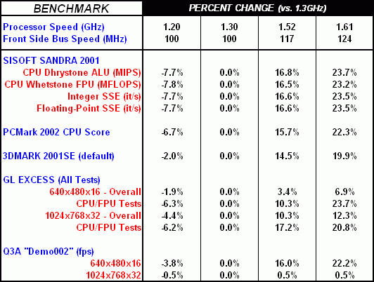 INTERPRETATION OF DATA / CONCLUSIONS: First of all, it's important to point out a critical factor affecting these results--the benchmark result increases seen for the two overclocked conditions is not just due to the higher CPU clockspeed! Keep in mind that the mode of overclocking here (and pretty much with any current Intel processor) is to increase the front-side bus speed. The CPU clockspeed is then determined by a fixed multiplier of that bus speed, which is 13.0 in the case of the Tualatin Celeron 1.3GHz processor. But boosting the FSB speed increases the speed of other system components, as well. The system memory runs correspondingly faster, by a directly proportional amount. Also, components on the PCI and AGP buses run somewhat faster, as well, because these bus speeds are set as a fixed fraction of the FSB value. Some motherboards allow you to reduce this factor as FSB speed is increased above 100MHz, but the AOpen AX6BC used in this study doesn't have that capability. So, the results obtained at the 1.61GHz processor speed (FSB = 124MHz) are significantly higher than you would see if Intel made a 1.61GHz version of the Tualatin Celeron that ran at the standard 100MHz bus speed. But even if the boost is not 100% attributable to the CPU clockspeed increase, it is no less real!