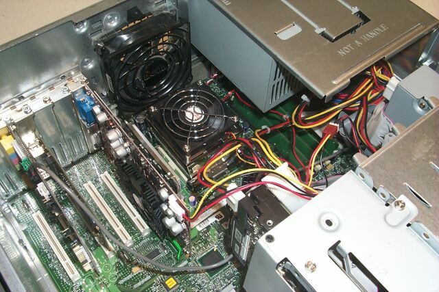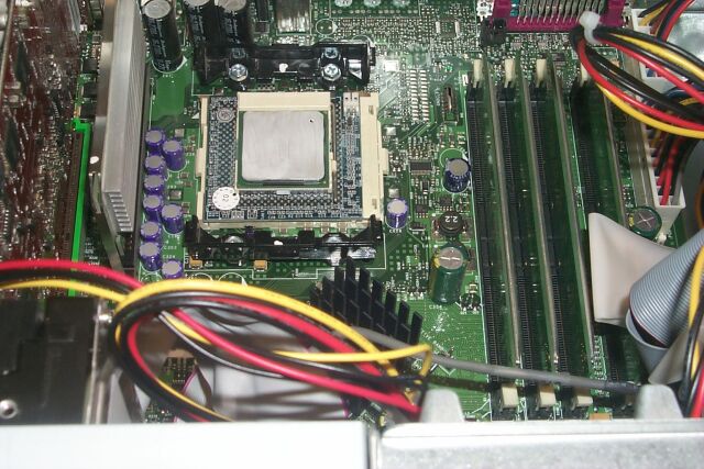 Click on pic to enlarge In this first photo, my Dimension 8100 case has been opened, the power supply cage has been swung up out of the way, and the green plastic airflow shroud over the processor has been removed. You should also temporarily remove the rear case fan, to give yourself some additional working room, though that hasn't been done yet in this photo. Note the finned passive heatsink mounted on the CPU at the center of the photo. Because this heatsink has no integrated fan, the green shroud is necessary to route the airflow from the case fan over the fins of the heatsink. Without it, the stock processor could overheat. The shroud will NOT be needed (indeed, it won't even fit anymore) after the installation of the PowerLeap rig, with its integrated cooling fan. The old shroud is reputed to make a nice little planter, though!